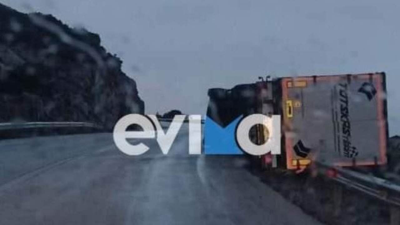 Σύμφωνα με αποκλειστικές πληροφορίες του evima.gr, η νταλίκα που φαίνεται στην φωτογραφία ντελαπάρισε από τον ισχυρό αέρα στο σημείο «Σύνορο» στο δρόμο προς Κάρυστο, με αποτέλεσμα να βγει εκτός του οδοστρώματος και να κρεμαστεί κυριολεκτικά στην προστατευτική μπάρα.