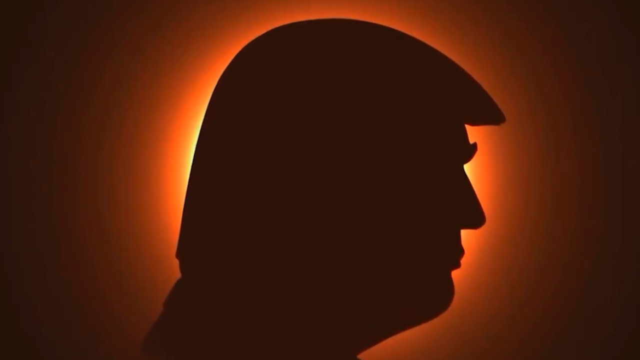 Ενώ το κεφάλι του καλύπτει ολόκληρο τον ήλιο – δημιουργώντας την… Τραμπική ηλιακή έκλειψη – μια φράση αναβοσβήνει στην οθόνη: «Θα σώσουμε την Αμερική και θα την κάνουμε υπέροχη ξανά».