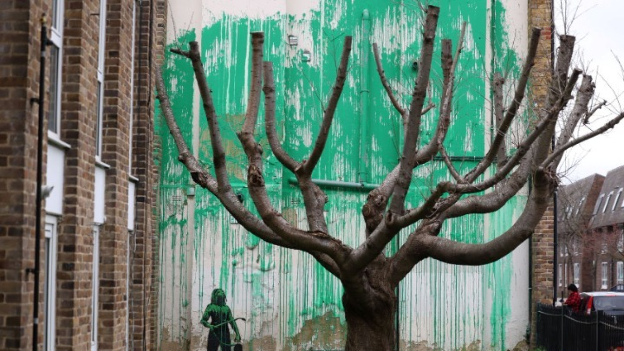Η τοιχογραφία, την οποία ο διάσημος καλλιτέχνης δρόμου επιβεβαίωσε τη Δευτέρα ότι φιλοτέχνησε, με ανάρτησή του στο Instagram, δημιουργήθηκε από πράσινη μπογιά, η οποία στάζει σε έναν τοίχο κι αντιπροσωπεύει το φύλλωμα ενός δέντρου που έχει γυμνά κλαδιά και βρίσκεται ακριβώς μπροστά.