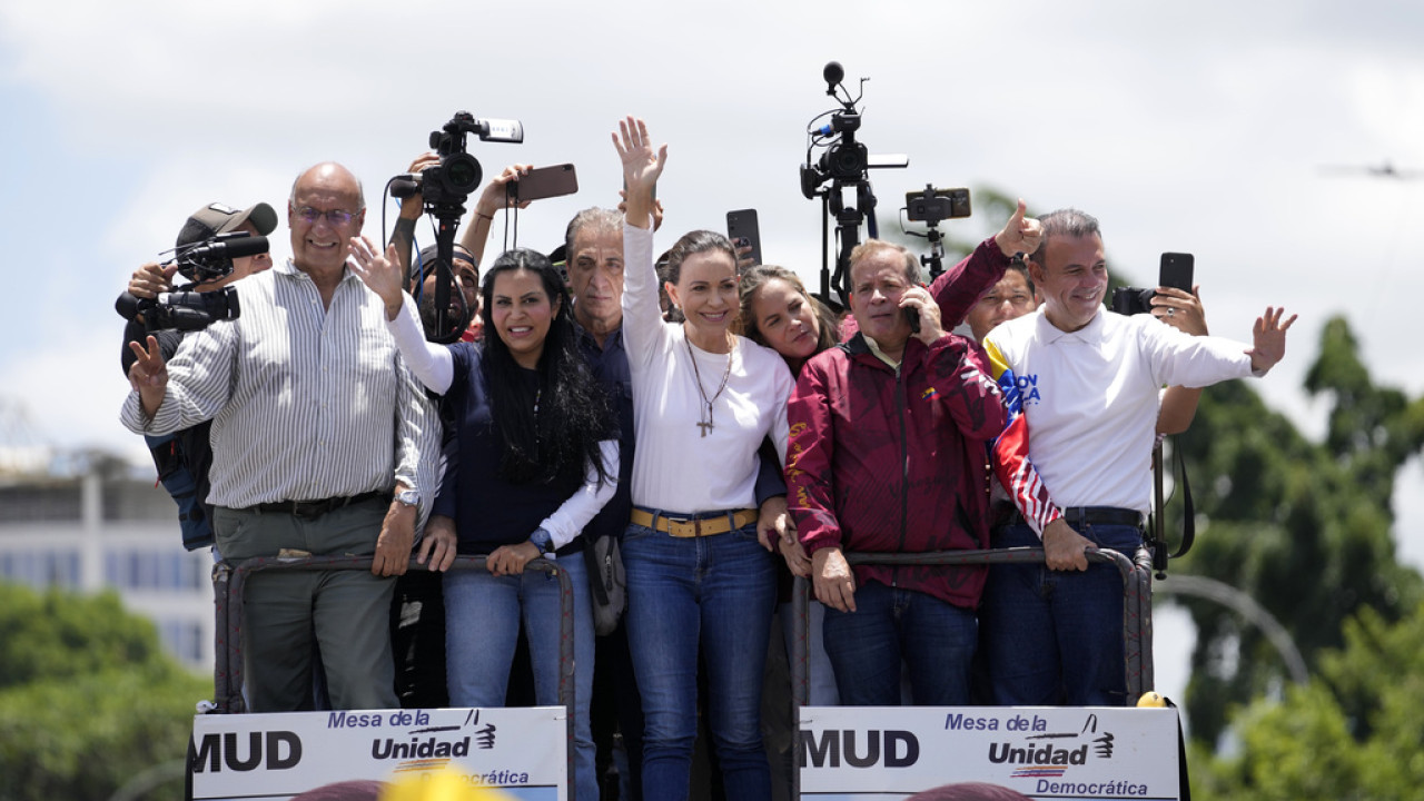 Η Μαρία Κορίνα Ματσάδο, η ηγέτιδα της αντιπολίτευσης, εμφανίστηκε το μεσημέρι σε ένα φορτηγό που έφερε γραμμένο το σύνθημα «Η Βενεζουέλα κέρδισε»