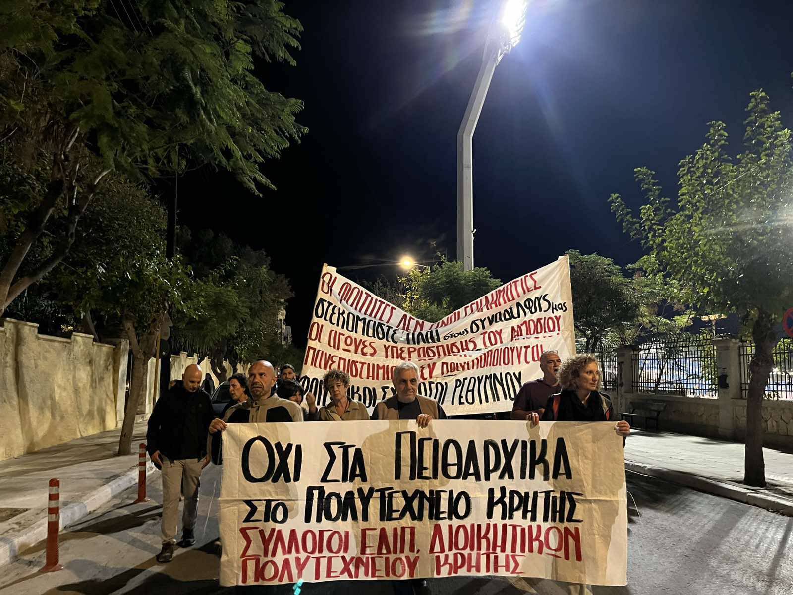 Την ίδια στιγμή, στο Πολυτεχνείο Κρήτης συγκροτείται Πειθαρχικό Συμβούλιο Φοιτητών, με μερίδα καθηγητών με κέντρο την σχολή των ΗΜΜΥ να πρωτοστατεί στην εκκίνηση του. Σε σύμπλευση με τον μηχανισμό της φοιτητικής παράταξης της ΔΑΠ-ΝΔΦΚ, οικοδομείται μια πολιτική σκευωρία άνευ προηγούμενου με ποινικές διώξεις σε βάρος της φοιτητιώσας νεολαίας, επειδή αγωνίζεται για την υπεράσπιση του δημοσίου πανεπιστημίου.
