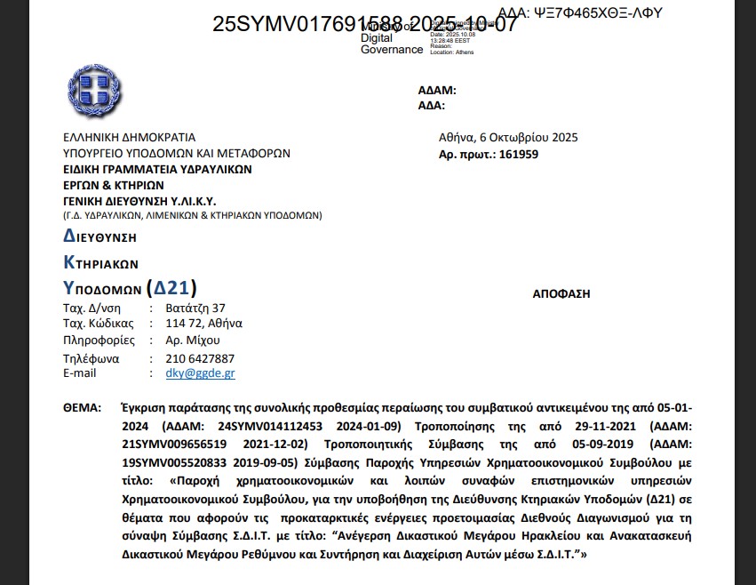 Σύμφωνα με την απόφαση της Ειδικής Γραμματείας Υδραυλικών Έργων και Κτηρίων, προκύπτει το συμπέρασμα συνολικής παράτασης της διαδικασίας καθώς ο ρόλος του χρηματοοικονομικού συμβούλου είναι άρρηκτα συνδεδεμένος με την πορεία του διεθνή διαγωνισμού.