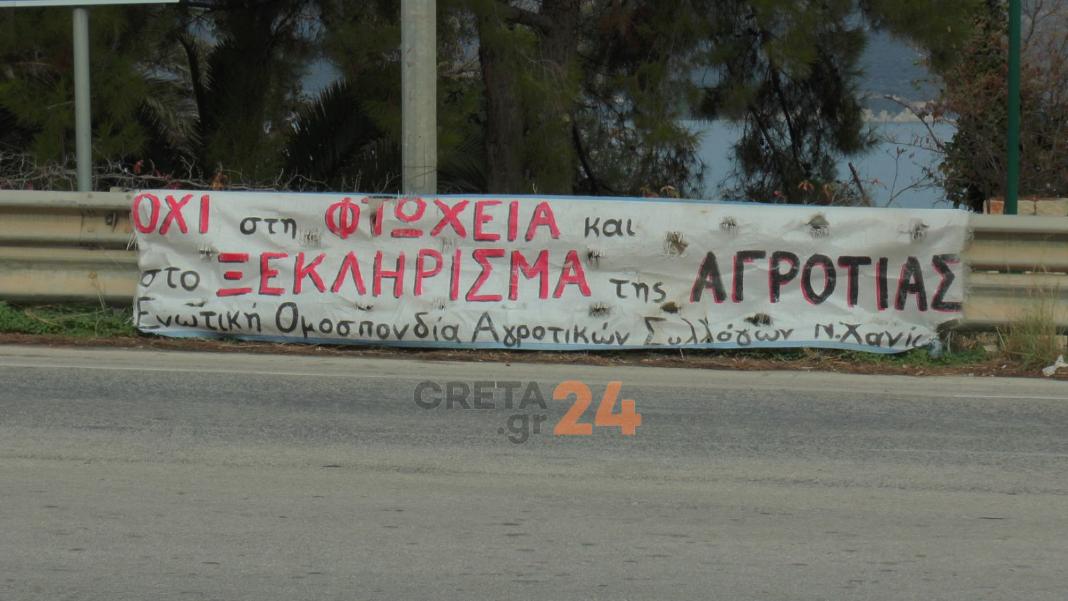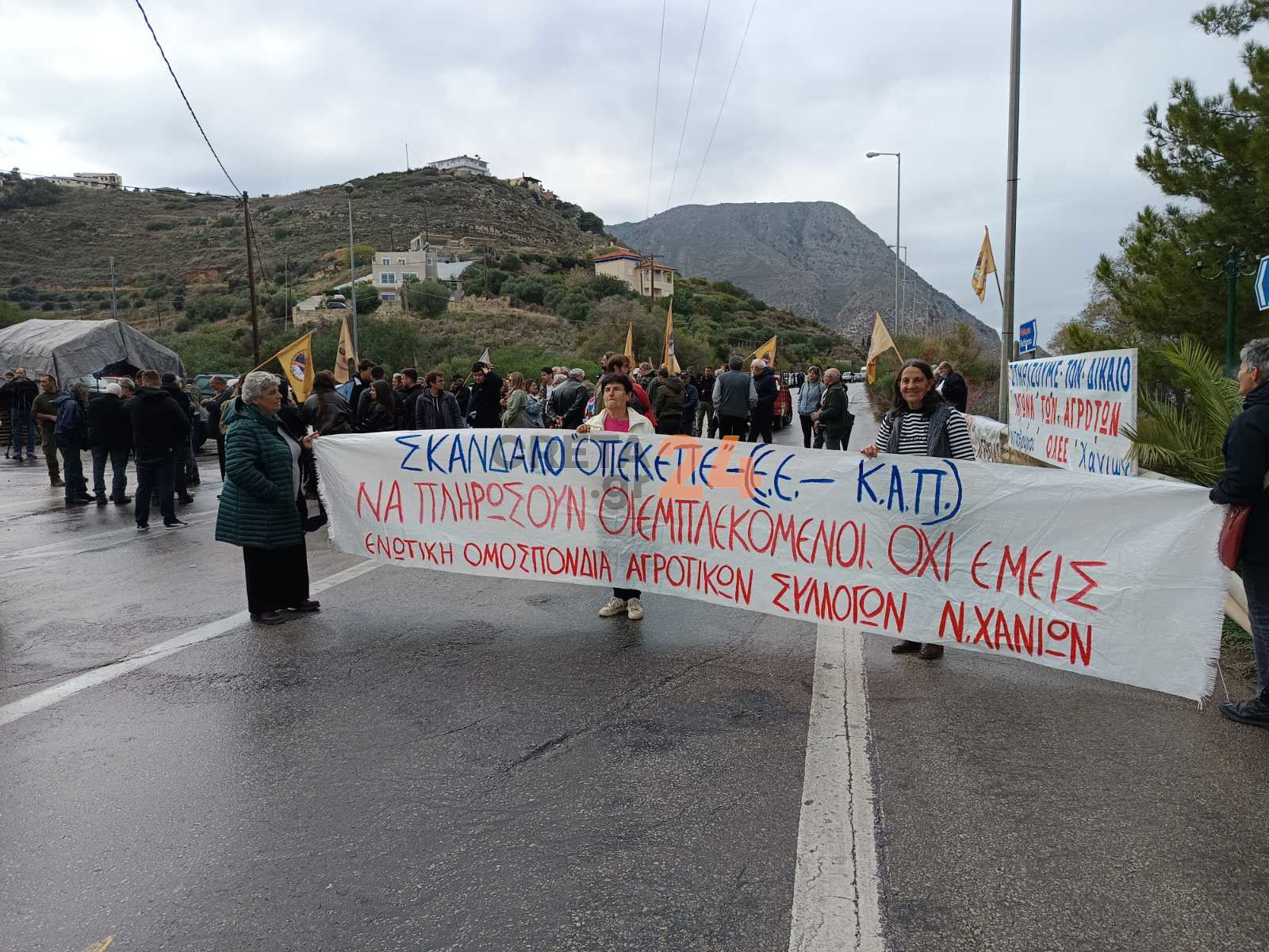 Από τις 12 το μεσημέρι της Κυριακής 7/12 ξεκίνησε η συγκέντρωση αγροτών στον κόμβο στα Μεγάλα Χωράφια, στον Βόρειο Οδικό Άξονα Κρήτης, που έχει διοργανώσει η Ενωτική Ομοσπονδία Αγροτικών Συλλόγων νομού Χανίων.