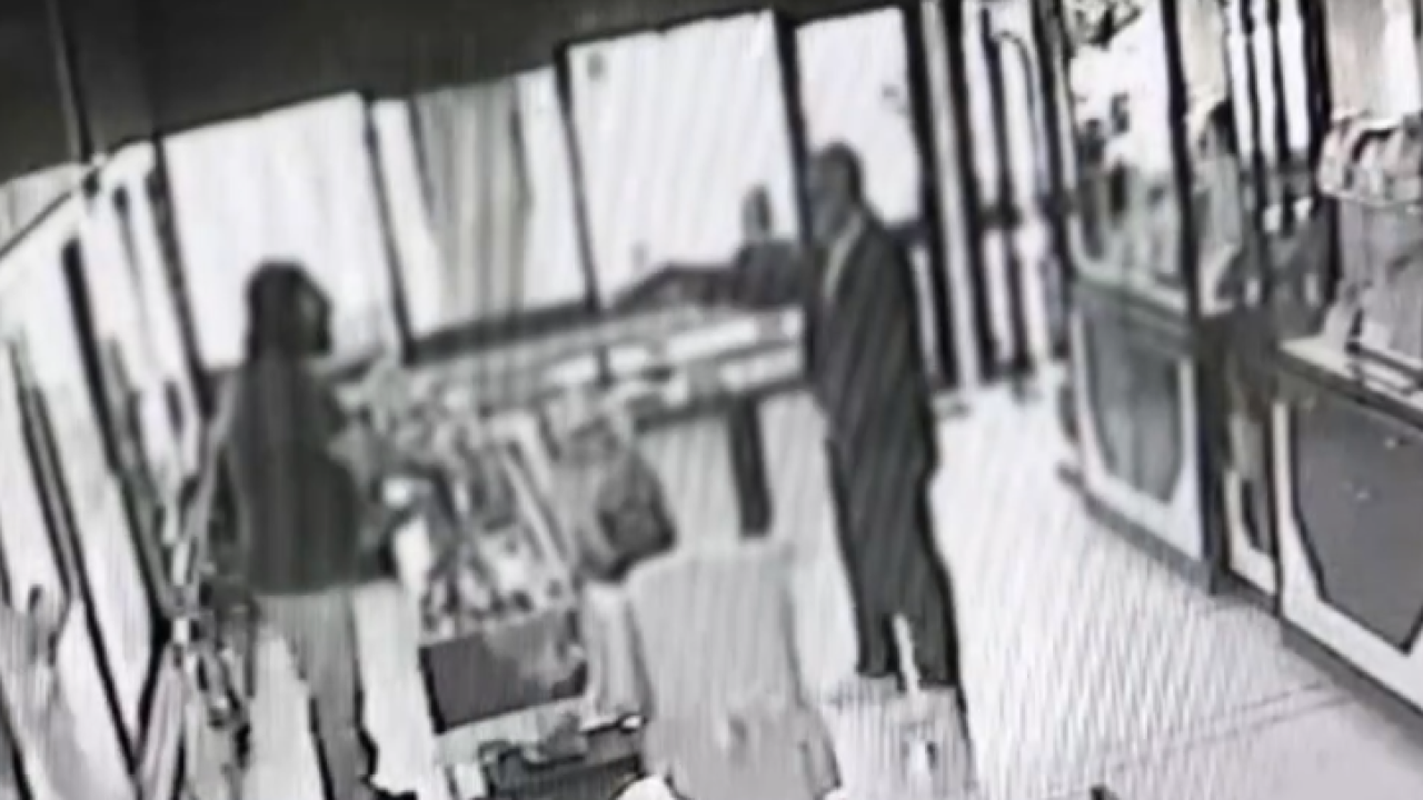 Κάποια στιγμή, ο δράστης γυρνάει την πλάτη του και ξαφνικά τραβάει ένα πιστόλι, σημαδεύει το θύμα στο κεφάλι και το αναγκάζει να ξαπλώσει στο δάπεδο. Κατόπιν, αρπάξει τα χρυσαφικά, τα βάζει σε τσάντα πλάτης, και βγαίνει με γρήγορες κινήσεις από το κατάστημα.