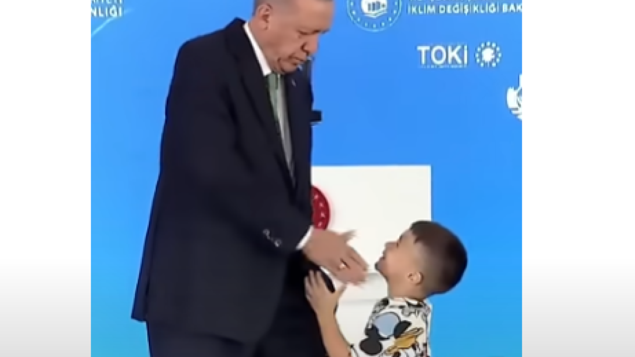 Κάποια στιγμή ανεβαίνουν στη σκηνή μικρά παιδιά. Ο πιτσιρίκος δεν έχει καταλάβει ότι ο Ερντογάν το προτείνει το χέρι για να το φιλήσει και απλώς τον… χαιρετά. Τότε ο Τούρκος πρόεδρος του… σπρώχνει το μάγουλο με το δεξί του χέρι και κάτι του λέει. Ο μικρός, εμφανώς σε αμηχανία, καταλαβαίνει ότι πρέπει να του φιλήσει το χέρι και μετά επιστρέφει να τον αγκαλιάσει.