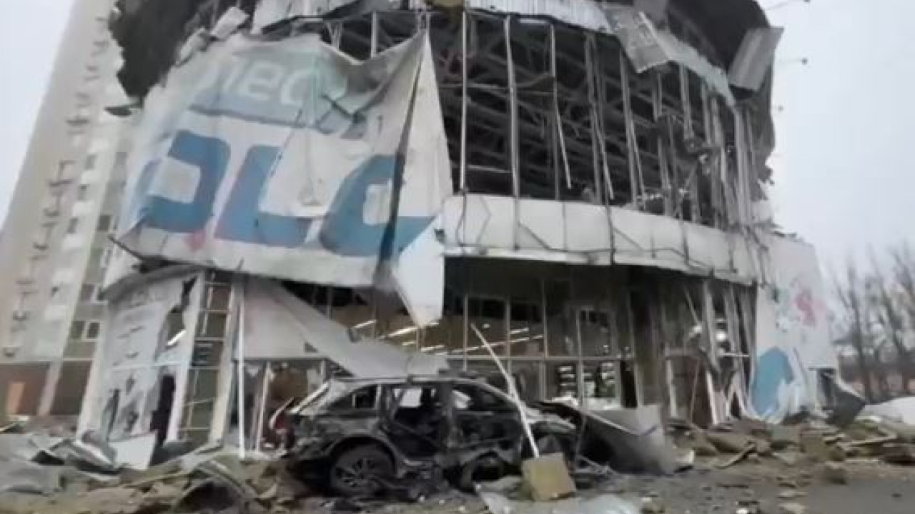 — Several cars are smashed in the parking lot. Craters are visible on the asphalt, close to a supermarket (right 📹). pic.twitter.com/2UNSBVKYQB