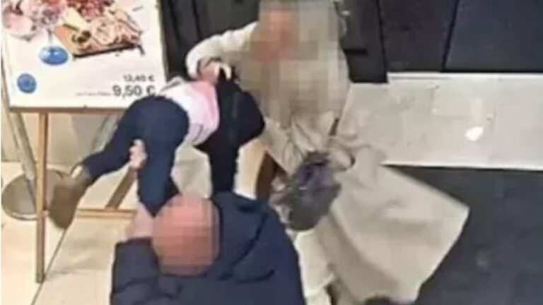 Στα πλάνα φαίνεται η οικογένεια να κατευθύνεται προς την έξοδο όταν ο δράστης, ντυμένος με μαύρο φούτερ και πράσινο παντελόνι, πλησιάζει ξαφνικά τη μητέρα και αρπάζει το παιδί, ένα κοριτσάκι μόλις 18 μηνών.