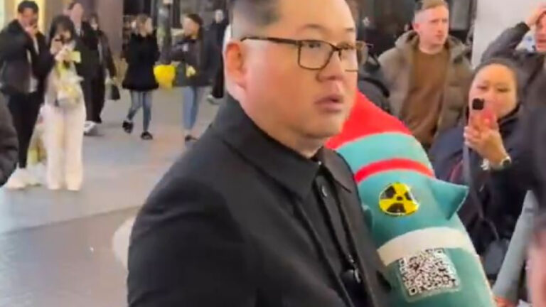 Μάλιστα, εκτός από τα μαλλιά, τα ρούχα και τα χαρακτηριστικά γυαλιά του ηγέτη της Βόρειας Κορέας, ο σωσίας του Κιμ Γιονγκ Ουν κρατάει στην αγκαλιά του και έναν λούτρινο βαλλιστικό πύραυλο.
