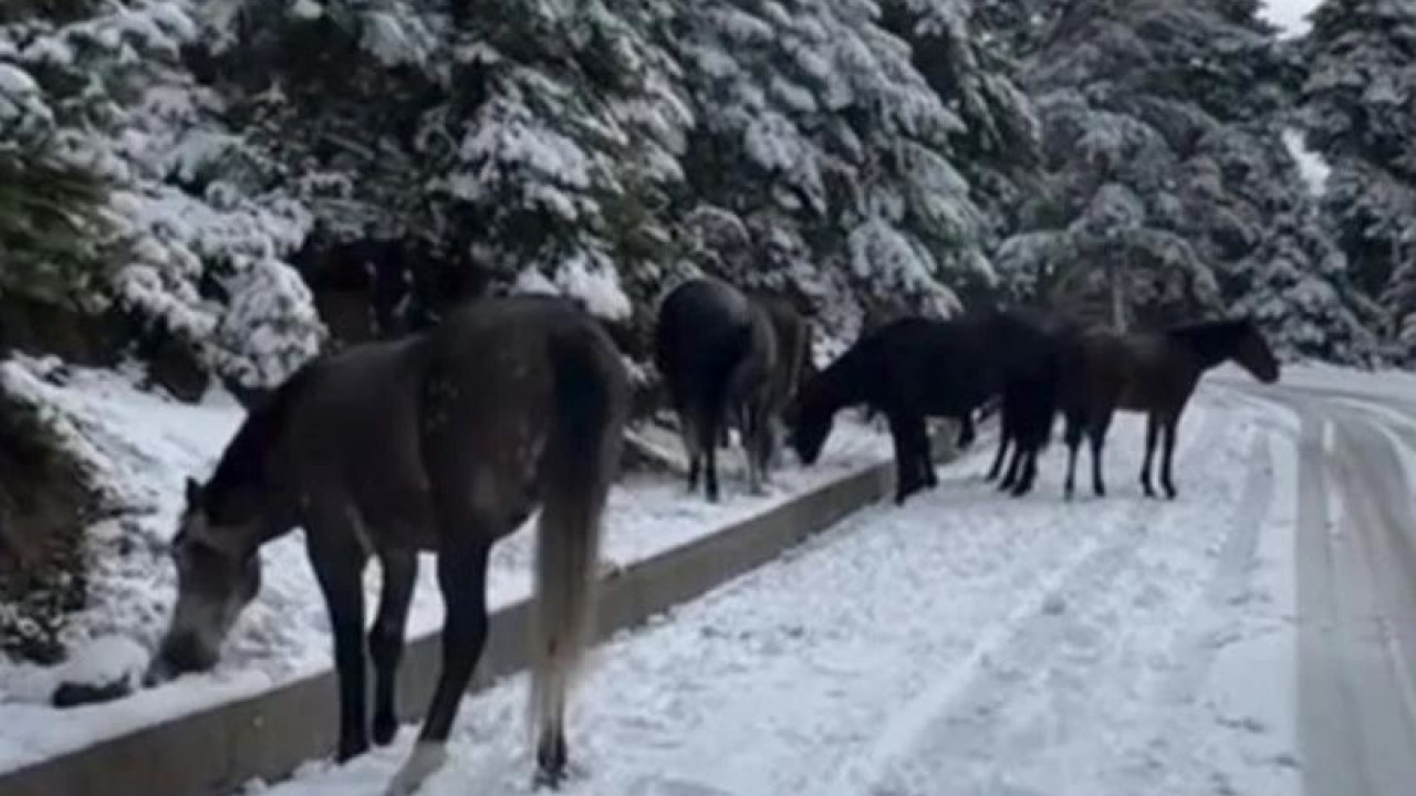 Με την κάμερα του κατέγραψε δεκάδες ελεύθερα άλογα στον χιονισμένο δρόμο προς το χωριό και ανέβασε το βίντεο στο Tik Tok.