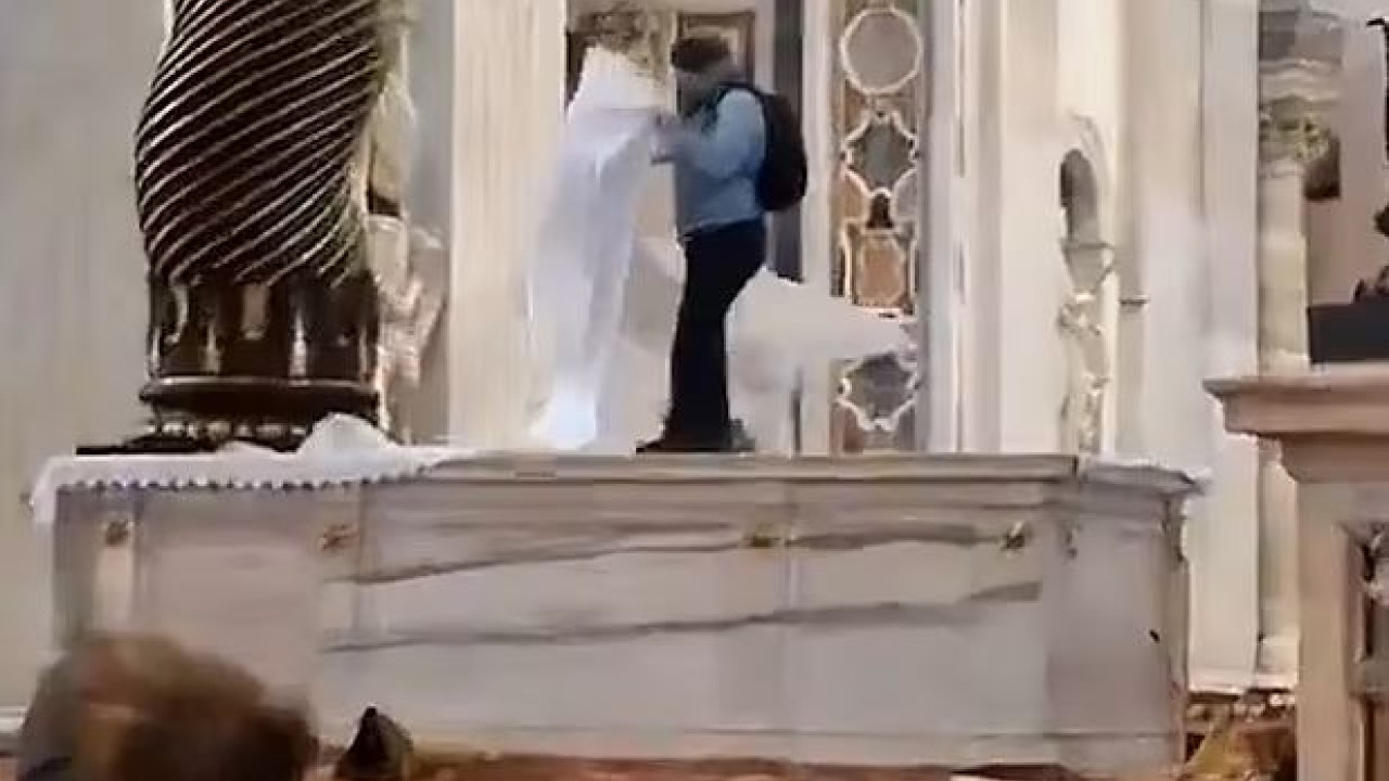 Ο άνδρας φαίνεται να κλωτσάει βίαια έξι χρυσά καντηλέρια από το βωμό ακριβώς πάνω από είσοδο του τάφου του Αγ. Πέτρου, ενώ τραβάει με μανία και το λευκό τραπεζομάντηλο