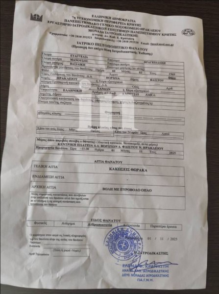 Σύμφωνα με το ιατρικό πιστοποιητικό θανάτου της 57χρονης γυναίκας που φέρνει στο φως το in.gr, ο θάνατός της Eυαγγελίας Φραγκιαδάκη στα Βορίζια είναι από πυροβόλο όπλο.