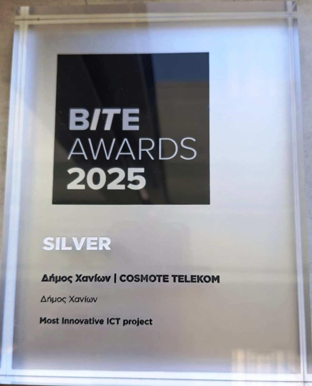 Ο Δήμος Χανίων απέσπασε το Silver Award στην κατηγορία Most Innovative ICT Project στα BITE Awards 2025, για το έργο «Έξυπνο σύστημα ελέγχου πρόσβασης στο Ενετικό Λιμάνι Χανίων», που υλοποιήθηκε σε συνεργασία με τον ανάδοχο COSMOTE TELEKOM. Η απονομή πραγματοποιήθηκε την Τρίτη 16 Σεπτεμβρίου 2025, στο πλαίσιο του θεσμού, που διοργανώνεται υπό την αιγίδα του Υπουργείου Ψηφιακής Διακυβέρνησης και του ΣΕΠΕ.