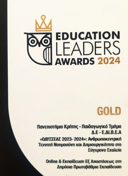 Μια πολύ σημαντική διάκριση στο πλαίσιο των “Educational Leaders Awards 2024”: Χρυσό βραβείο στην κατηγορία: «Online & Εκπαίδευση Εξ Αποστάσεως στη Δημόσια Πρωτοβάθμια Εκπαίδευση» στο Πανεπιστήμιο Κρήτης | Παιδαγωγικό Τμήμα Δ.Ε | Ε.ΔΙ.Β.Ε.Α, για το πρόγραμμα «ΟΔΥΣΣΕΑΣ 2023-2024: Ανθρωποκεντρική Τεχνητή Νοημοσύνη και Δημιουργικότητα στο Σύγχρονο Σχολείο».