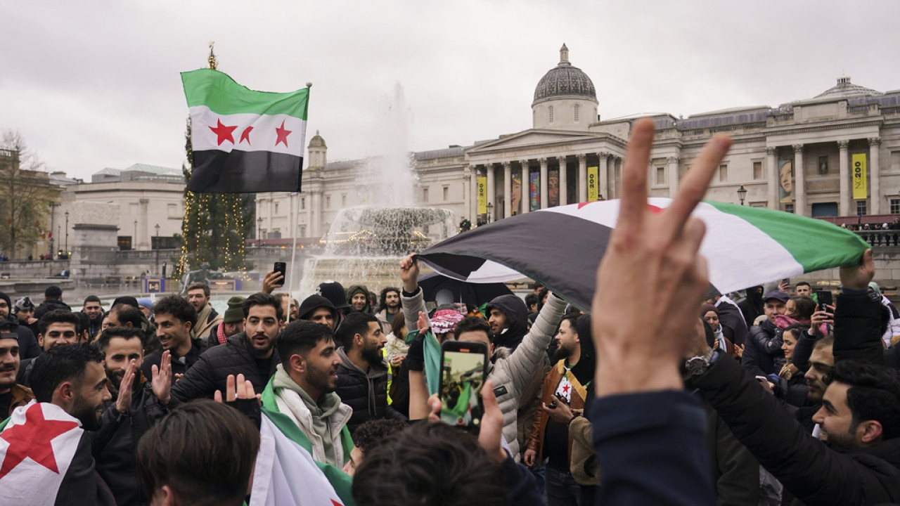 Εκατοντάδες Σύροι γιόρτασαν σήμερα το απόγευμα στην Πλατεία Τραφάλγκαρ του Λονδίνου την πτώση του Μπασάρ αλ Άσαντ, φωνάζοντας αγκαλιασμένοι τη λέξη «Ελευθερία».