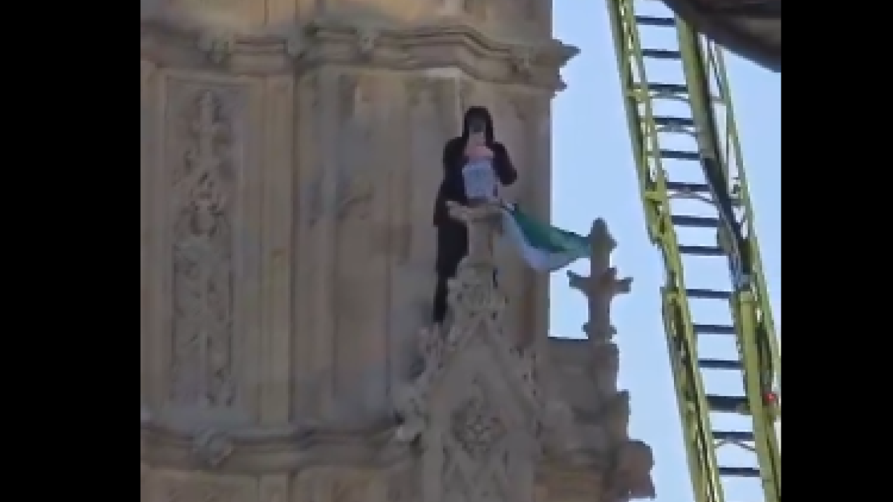 Κρατώντας μια παλαιστινιακή σημαία, ο 29χρονος Ντάνιελ Ντέι, ανέβηκε 25 μέτρα πάνω από το κτίριο, επίσημα γνωστό ως Πύργος της Ελισάβετ, περίπου στις 7:20 το πρωί του Σαββάτου και παρέμεινε εκεί για 16 ώρες μέχρι να συμφωνήσει να κατέβει, είπαν ο δικηγόρος και οι εισαγγελείς του στο Δικαστήριο του Westminster του Λονδίνου.