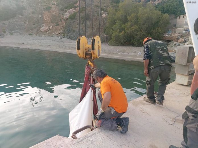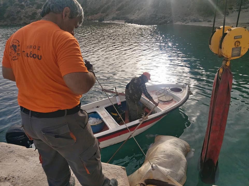 Όπως θα δείτε και στις φωτογραφίες του zarpanews.gr, ειδικό κλιμάκιο του Δήμου, βρέθηκε στο σημείο και έστησε επιχείρηση για την ανάσυρσή της από την θάλασσα, με τη βοήθεια γερανού αλλά και εθελοντών, κατοίκων του νησιού.
