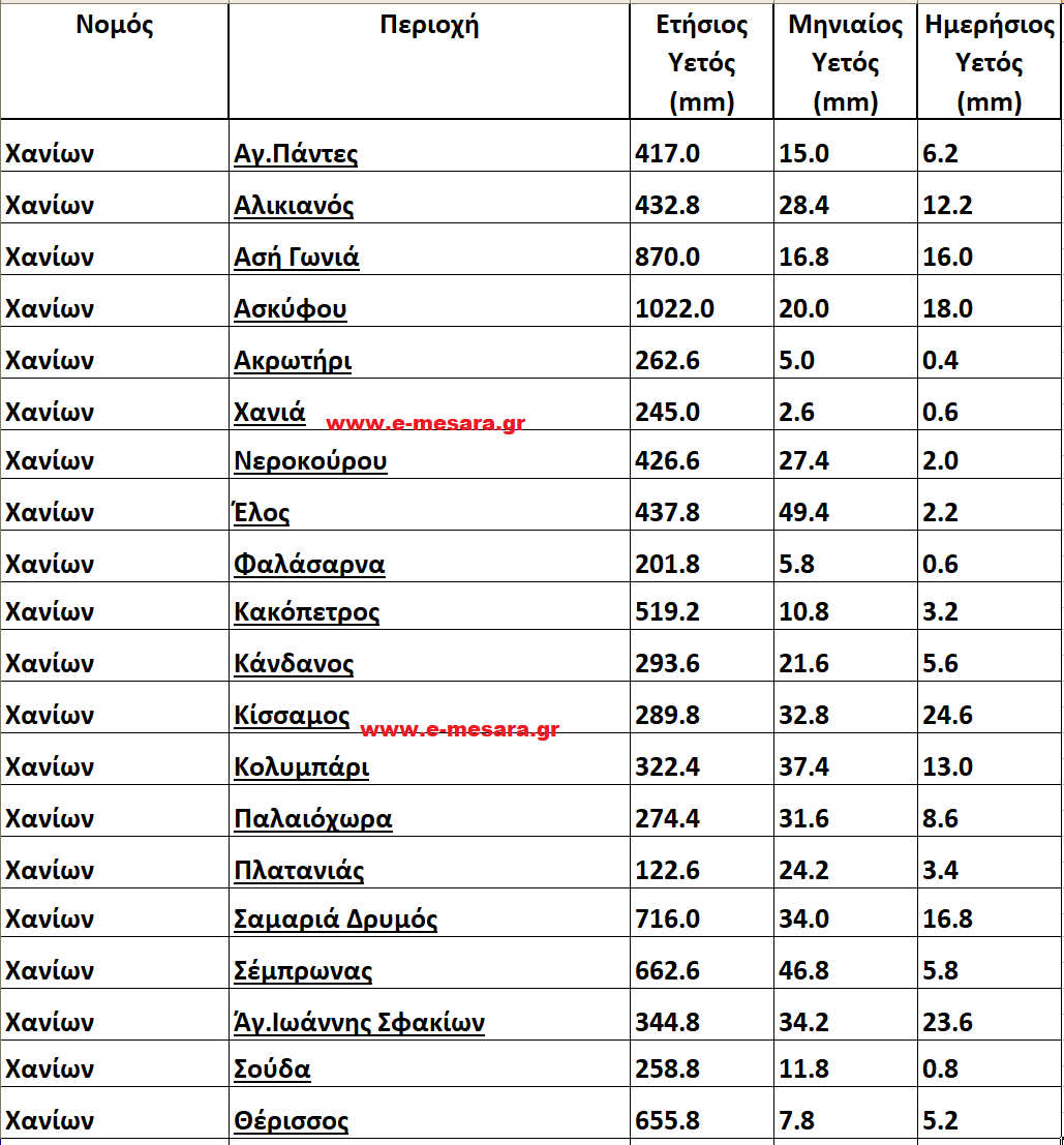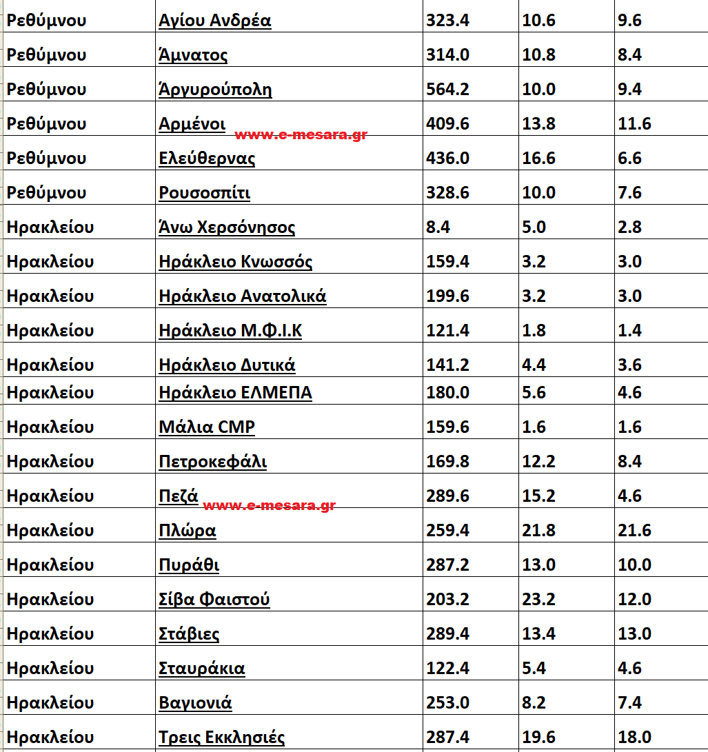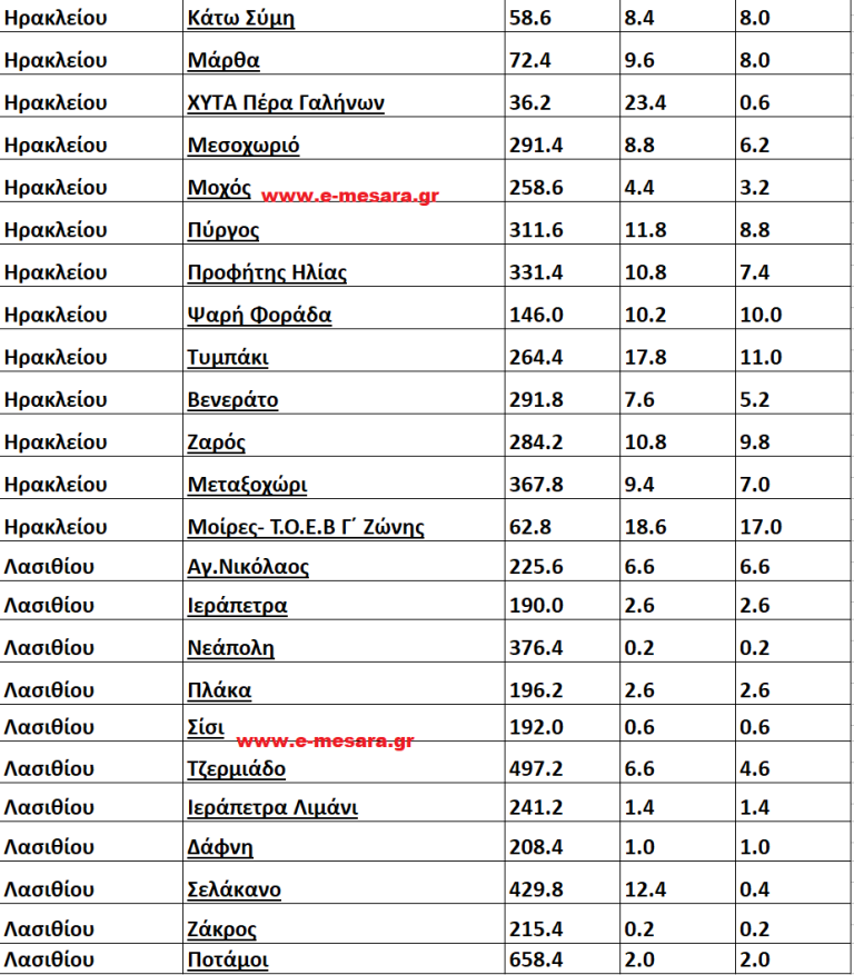 Σύμφωνα με τα διαθέσιμα στοιχεία από τους μετεωρολογικούς σταθμούς του meteo.gr και του cretaweather.gr, μέχρι τις 8:30 το πρωί της Πέμπτης είχαν καταγραφεί σημαντικές ποσότητες βροχής σε αρκετές περιοχές. Σημειώνεται πως οι σταθμοί που δεν εμφανίζονται είτε δεν κατέγραψαν χιλιοστά, είτε παρουσίασαν σφάλματα μέτρησης, είτε παραμένουν ανενεργοί.