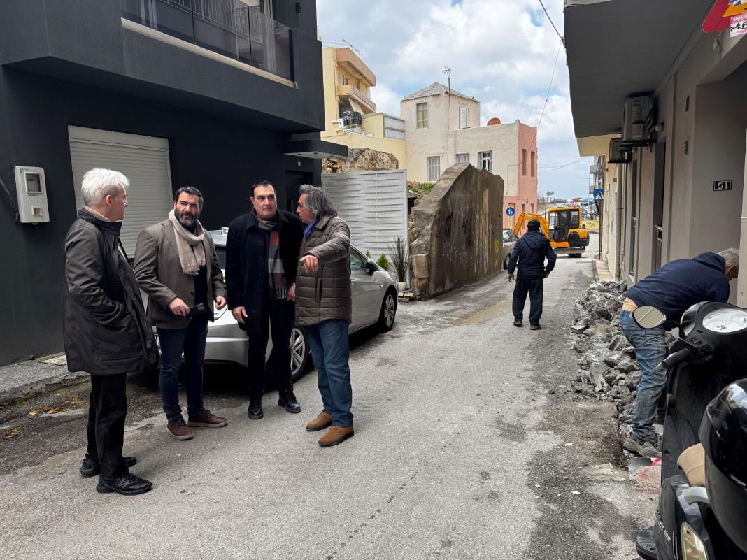 Αυτοψία στις πρώτες εργασίες του έργου ανάπλασης της οδού Δελημάρκου και κάθετων οδών της στην Αγία Τριάδα, πραγματοποίησε ο Δήμαρχος Ηρακλείου Αλέξης Καλοκαιρινός, μαζί με τον Αντιδήμαρχο Τεχνικών Υποδομών & Βιώσιμης Κινητικότητας Γιώργο Σισαμάκη, τον επιβλέποντα του έργου Γιώργο Ταβερναράκη και την Πρόεδρο της 1ης Δημοτικής Κοινότητας Θεοδοσία Αγγελιδάκη.