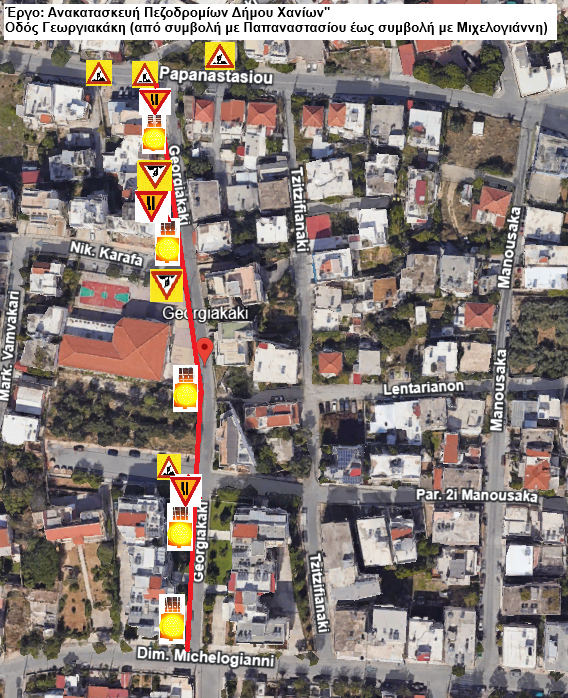 Στο πλαίσιο αυτό, από σήμερα, ξεκινούν οι εργασίες ανακατασκευής των πεζοδρομίων επί της οδού Ιωάννη Γεωργιακάκη στα Λενταριανά του Δήμου Χανίων. Το έργο αφορά το δυτικό τμήμα της οδού, όπου τα πεζοδρόμια θα ανακατασκευαστούν πλήρως για να εξασφαλίσουν την ασφαλή διέλευση των πεζών, ιδίως των μαθητών προς το 19ο Δημοτικό Σχολείο Χανίων ενώ το συνολικό μήκος της παρέμβασης ανέρχεται σε περίπου 200 μέτρα