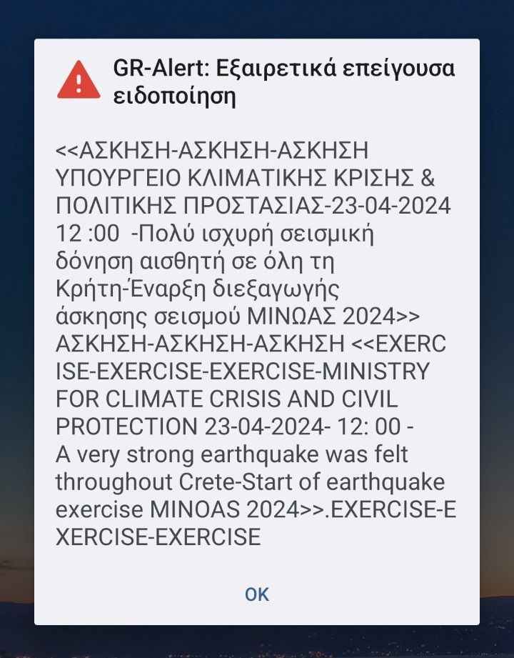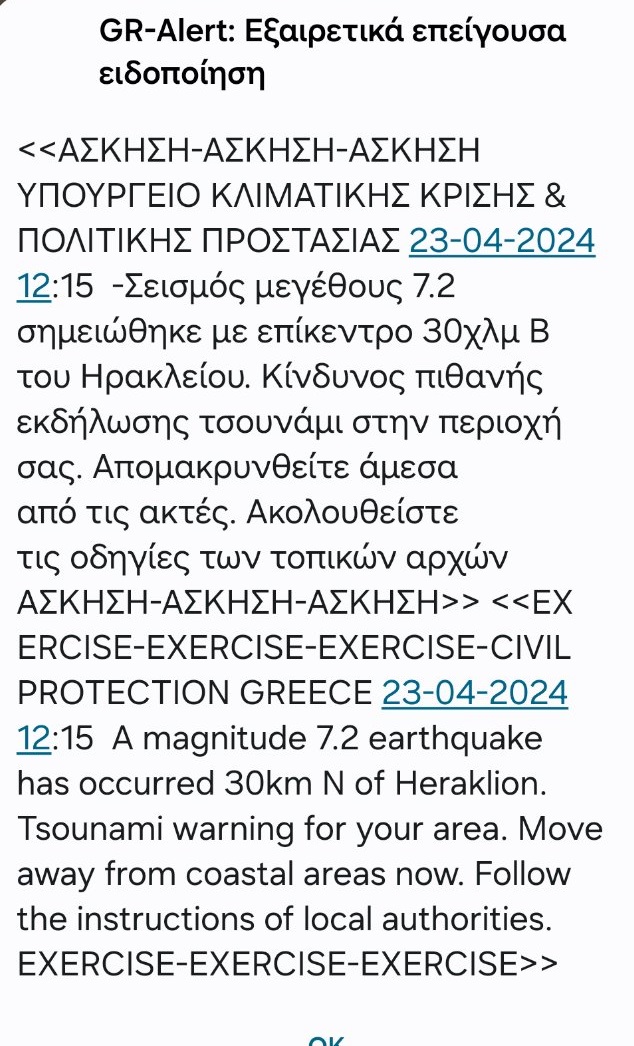 Οι κάτοικοι της Κρήτης δέχτηκαν δύο μηνύματα από το 112. Το πρώτο εστάλη στις 12:00 και αφορούσε σεισμό που εκδηλώθηκε στην περιοχή σύμφωνα με το σενάριο της άσκησης, ενώ το δεύτερο εστάλη στις 12:15 και προειδοποιούσε για την πιθανή εκδήλωση τσουνάμι λόγω του σεισμού των 7,2 Ρίχτερ.