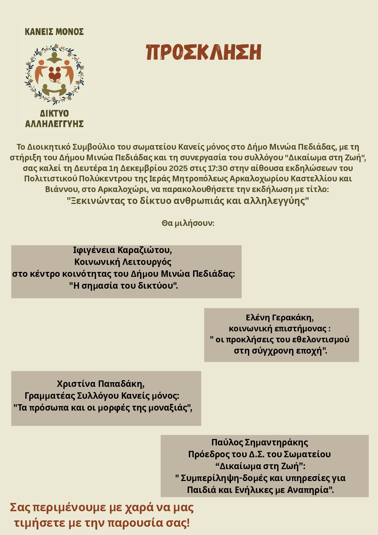 Δράση ενημέρωσης και ευαισθητοποίησης, διοργανώνει τη Δευτέρα 1 Δεκεμβρίου, στις 17:30, στην αίθουσα εκδηλώσεων του Πολιτιστικού Πολύκεντρου της Ιεράς Μητροπόλεως Αρκαλοχωρίου, Καστελλίου και Βιάννου, το Εθελοντικό Σωματείο, κοινωνικού και περιβαλλοντικού χαρακτήρα “ΚΑΝΕΙΣ ΜΟΝΟΣ”, με τη στήριξη του Δήμου Μινώα Πεδιάδας και σε συνεργασία με το Σωματείο Γονέων, Κηδεμόνων και Φίλων Ατόμων με Αναπηρία “Δικαίωμα στη Ζωή”. Η εκδήλωση με τίτλο, “Ξεκινώντας ένα δίκτυο ανθρωπιάς και αλληλεγγύης”, αποτελεί την απαρχή μιας σειράς δράσεων που θα έχουν ως πυρήνα τη στήριξη, την παρουσία και τη βοήθεια στις απαιτήσεις, τους προβληματισμούς και τις ανησυχίες που εμπεριέχουν τα κοινωνικά ζητήματα, σε διαρκή επαφή και συνεργασία με όλες τις υπηρεσίες, δομές και κάθε σχετικό φορέα.