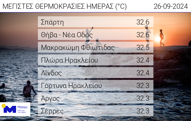 Όπως φαίνεται στον πίνακα που παρουσιάζονται οι 8 σταθμοί του δικτύου που κατέγραψαν τις υψηλότερες θερμοκρασίες, θερμότερες περιοχές την Πέμπτη 26/09 ήταν η Πελοπόννησος, η Στερεά Ελλάδα, η Κρήτη, η Ρόδος και η Μακεδονία.