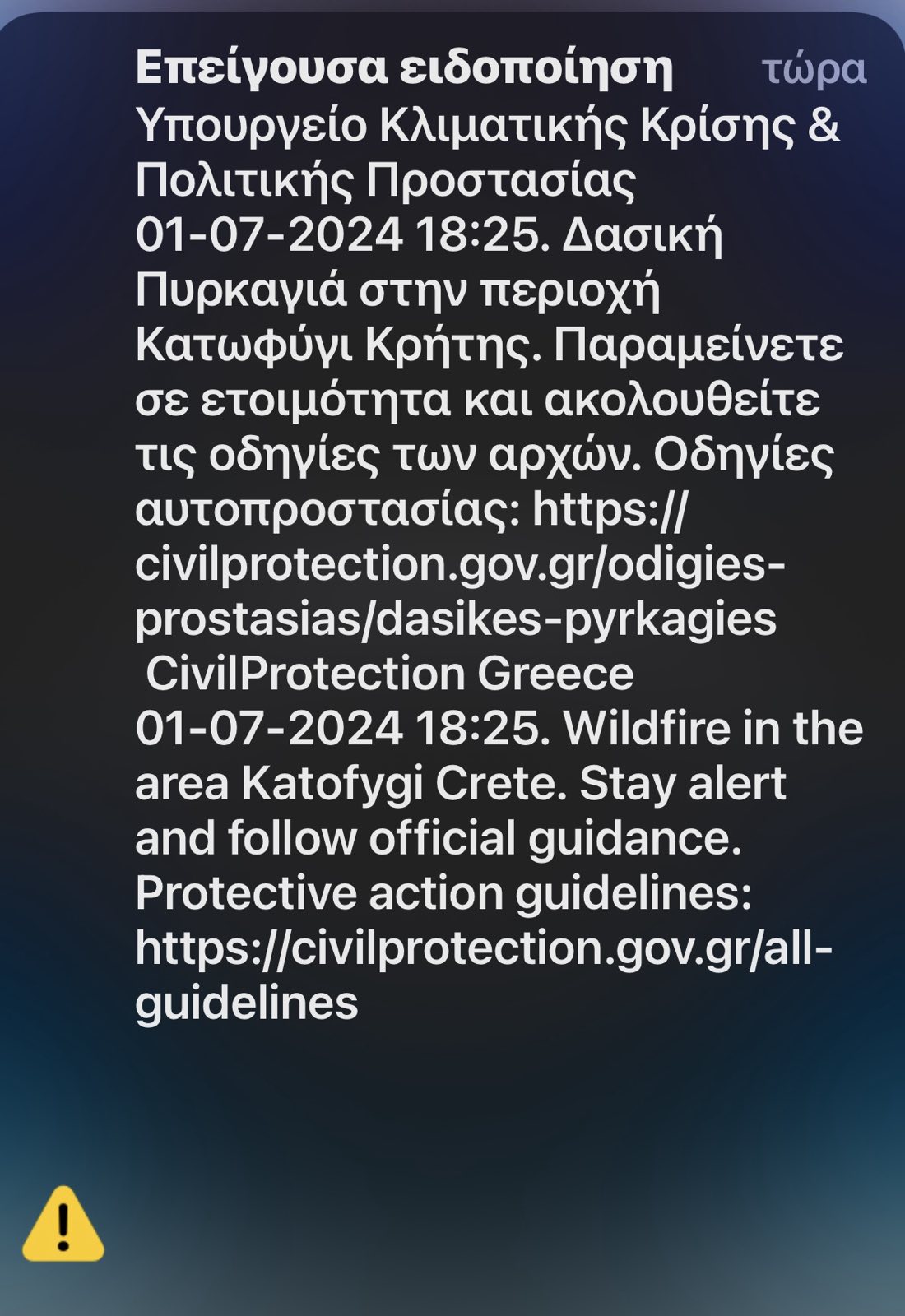 Στις 18:25 εστάλη μήνυμα από το 112 στους κατοίκους να παραμείνουν σε ετοιμότητα και να ακολουθούν τις οδηγίες των Αρχών.