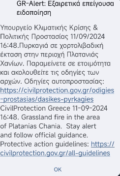 Υπενθυμίζεται ότι στις 16:48 εστάλη μήνυμα από το 112 στους κατοίκους του Πλατανιά, να παραμείνουν σε ετοιμότητα και να ακολουθούν τις οδηγίες των Αρχών.