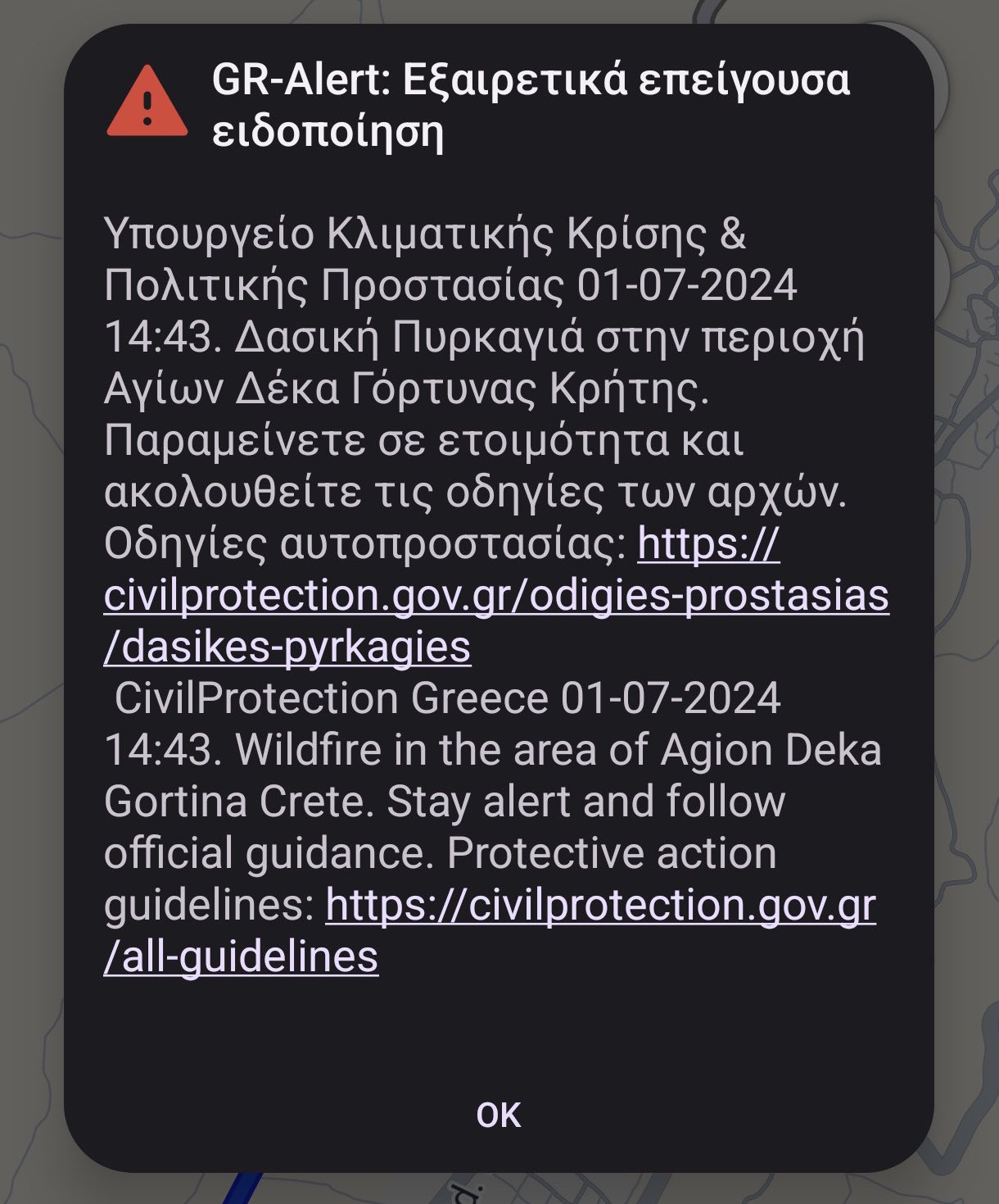 Στις 14:43 οι κάτοικοι της περιοχής ειδοποιήθηκαν με μήνυμα του 112 να παραμένουν σε ετοιμότητα και να ακολουθούν τις οδηγίες των αρχών.