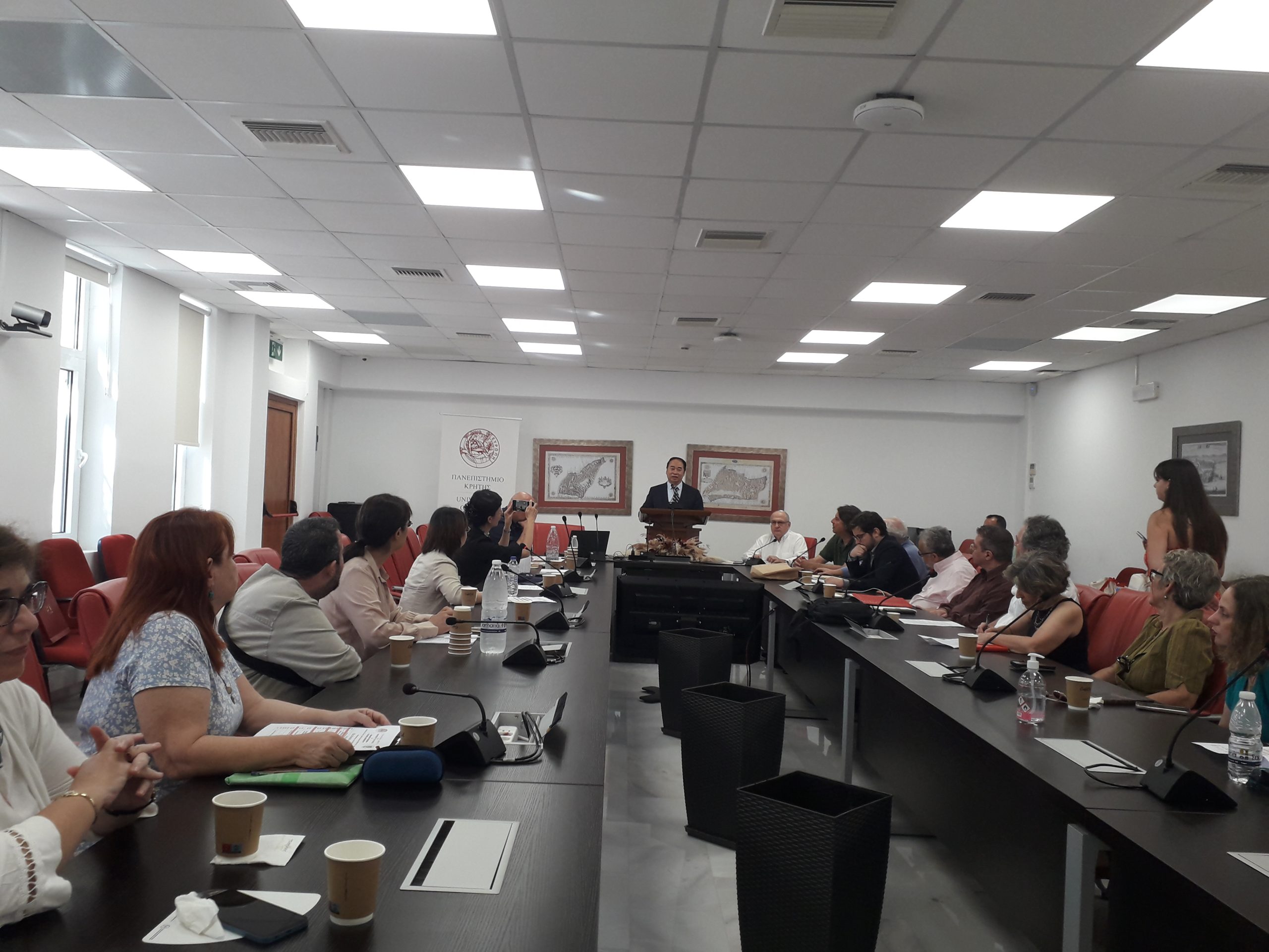 Χαιρετισμό απηύθυναν ο Πρύτανης του Πανεπιστημίου Κρήτης Καθηγητής Γ.Μ. Κοντάκης και ο Πρόεδρος του Συμβουλίου του Βeijing Foreign Studies University WANG Dinghua. Ο Αντιπρύτανης Ακαδημαϊκών Υποθέσεων, Δια Βίου Μάθησης, Διεθνών Σχέσεων και Εξωστρέφειας, Καθηγητής Γ. Κοσιώρης παρουσίασε το προφίλ του Ιδρύματος, ενώ τη συζήτηση συντόνισε ο Πρόεδρος του Τμήματος Πολιτικής Επιστήμης, Καθηγητής Η. Γεωργαντάς. Παρευρέθηκαν ο Αντιπρύτανης Προγραμματισμού, Διοικητικών Υποθέσεων και Φοιτητικής Μέριμνας, Δ. Μυλωνάκης, ο Αντιπρύτανης Οικονομικών και Υποδομών, Καθηγητής Κ. Σπανουδάκης, η Καθηγήτρια Ε.Μ. Ταμιωλάκη, Αντιπρύτανης Ανάπτυξης, Διεθνών Σχέσεων και Εξωστρέφειας από τον Σεπτέμβριο του 2024 καθώς και οι Πρόεδροι και διδάσκοντες των Ακαδημαϊκών Τμημάτων των Σχολών Ρεθύμνου.